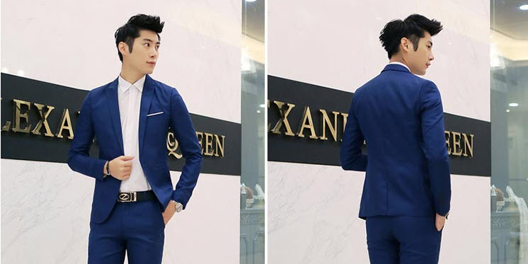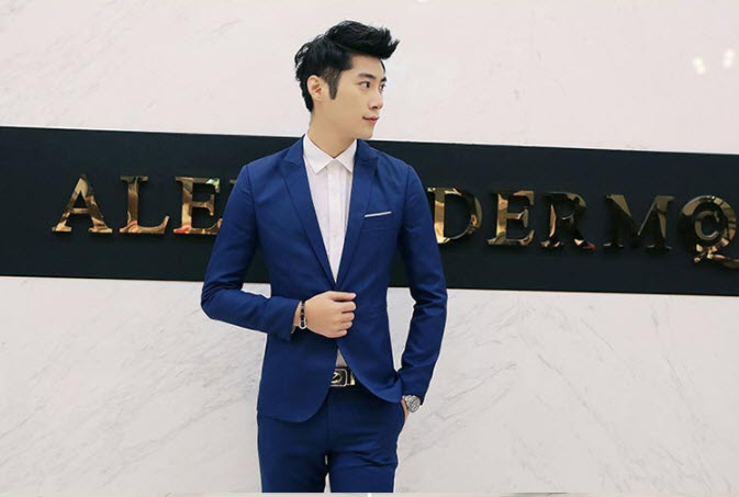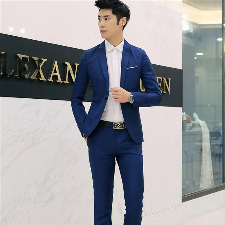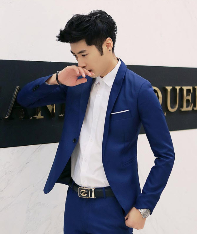 พร้อมส่ง เสื้อสูทผู้ชาย สีน้ำเงิน แขนยาว กระดุมหน้าหนึ่งเม็ด แต่งกระเป๋าอกสีขาว เสื้อเข้ารูป ใส่ทำงาน ใส่ออกงาน ใส่เป็นสูทลำลอง มีซับใน ชายเสื้อด้านหลังผ่ากลาง