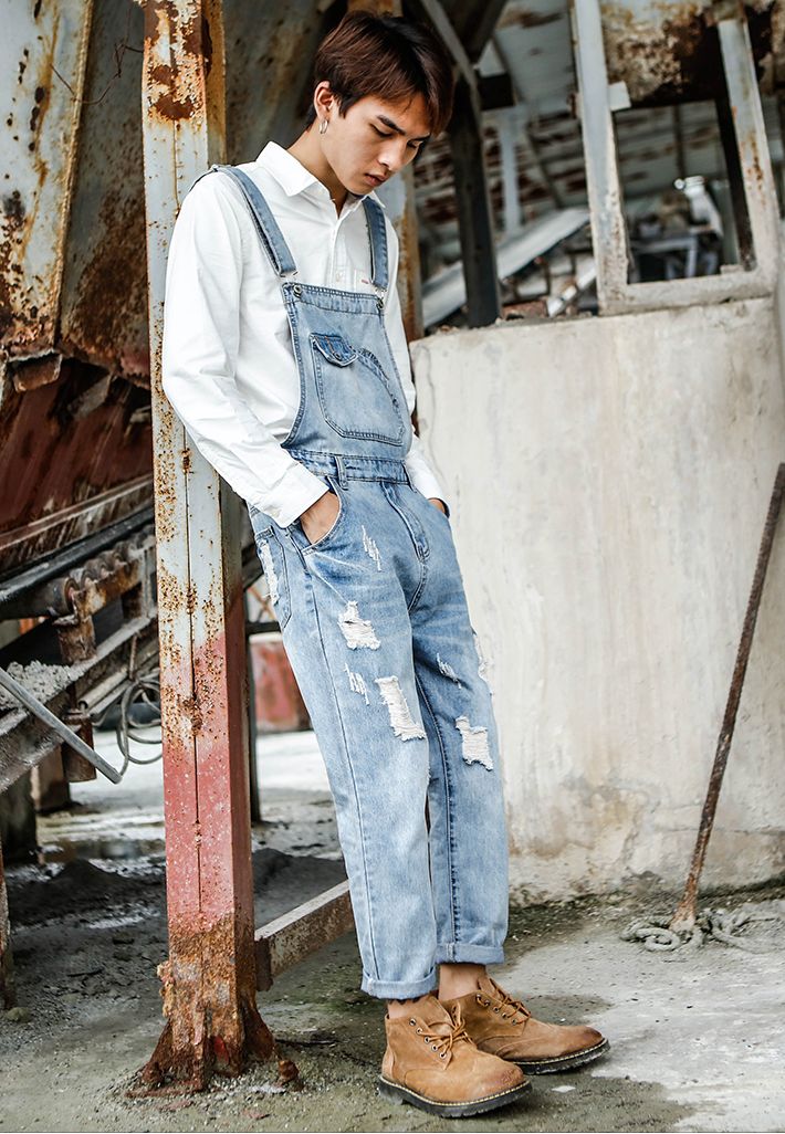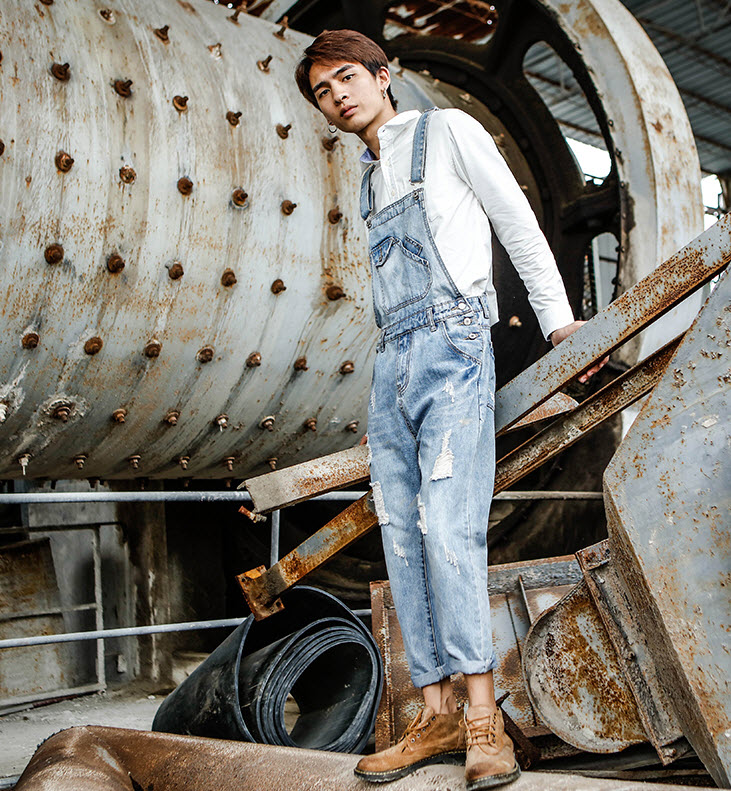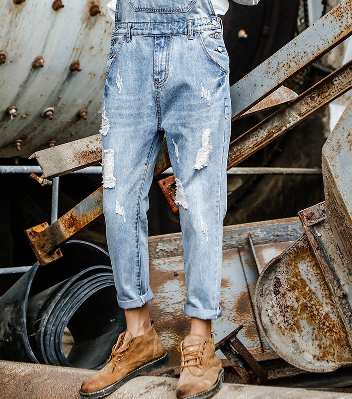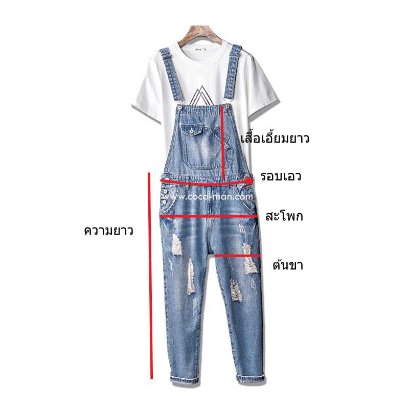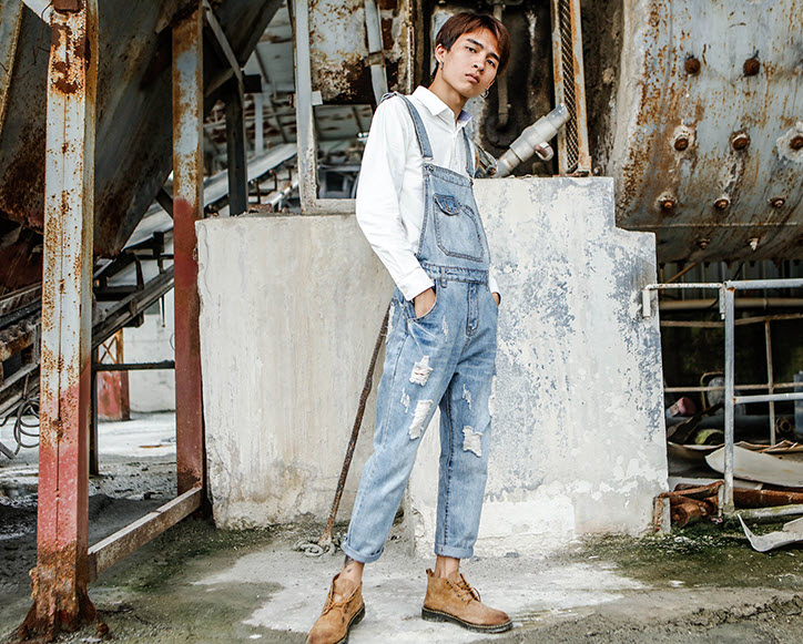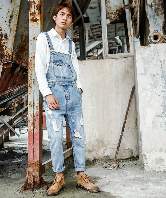 ชุดเอี๊ยมยีนส์ กางเกงขายาว ผ้ายีนส์ สีฟ้าอ่อน แต่งขาดที่ขา มีกระเป๋าหลัง แต่งขาดเซอร์ๆ สุดแนว สไตล์เซอร์ สายเอี๊ยมสามารถปรับความยาวได้ ชุดเอี้ยมผู้ชาย