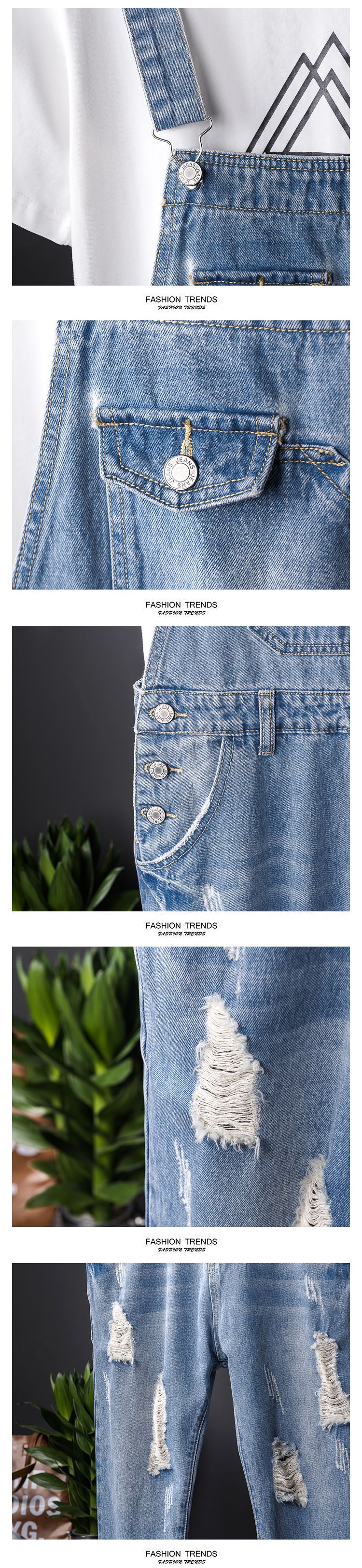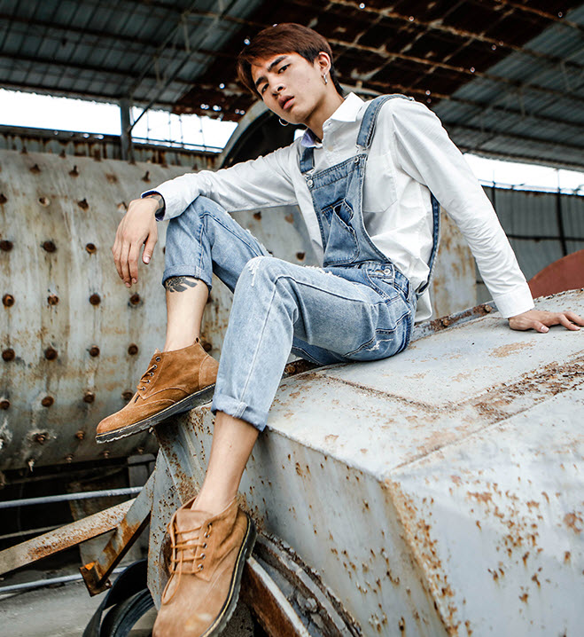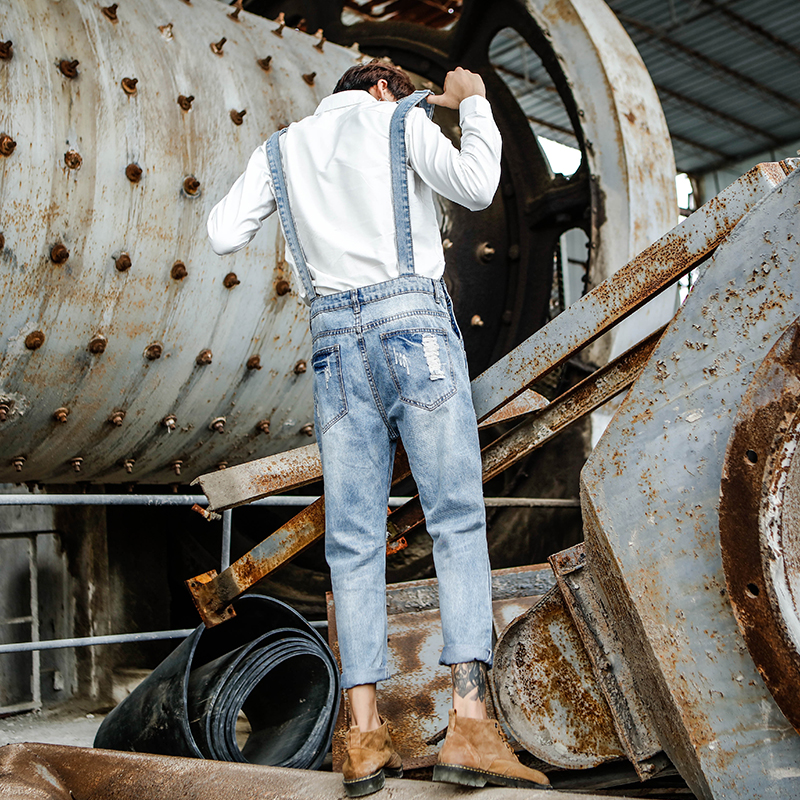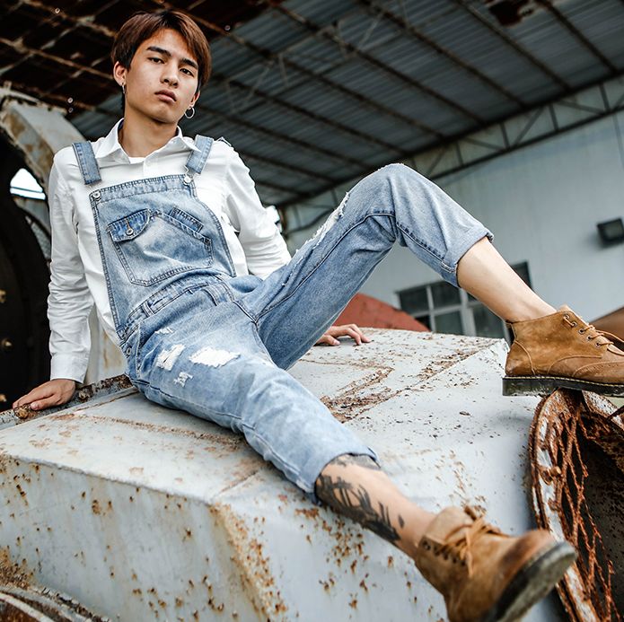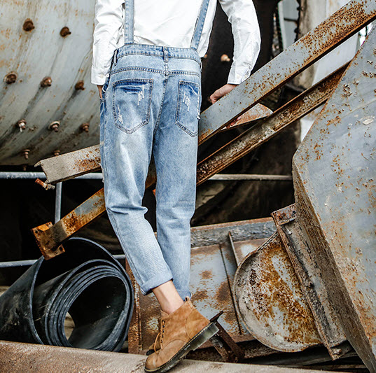 ชุดเอี๊ยมยีนส์ กางเกงขายาว ผ้ายีนส์ สีฟ้าอ่อน แต่งขาดที่ขา มีกระเป๋าหลัง แต่งขาดเซอร์ๆ สุดแนว สไตล์เซอร์ สายเอี๊ยมสามารถปรับความยาวได้ ชุดเอี้ยมผู้ชาย
